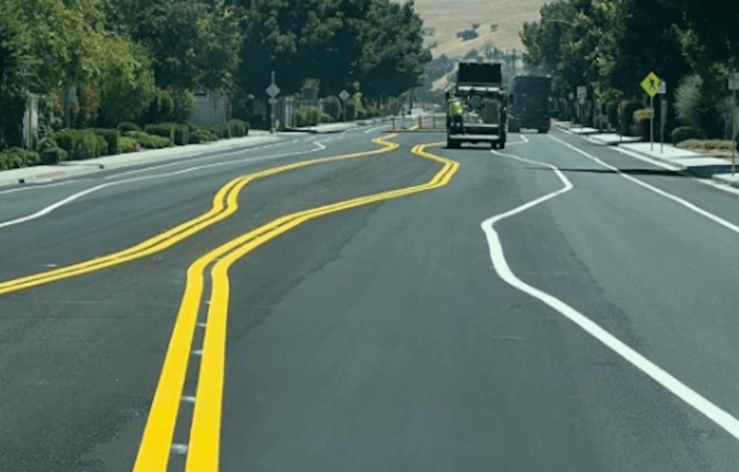 Behold the newly painted traffic lines on a highway in Hollister, California.
