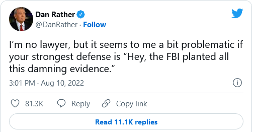 Here, the Trump defense brigade is getting way, way ahead of the facts, which are bad enough. Claims are being made—not by Trump or his lawyers, at least so far—that the FBI planted evidence during the search. This prompted the tweet by Dan Rather above, which is even more irresponsible than the claims of planted evidence.