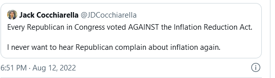 3. Back to the cheating theme, we have the Inflation Reduction Act, now headed to the President’s desk. You will recall that President Biden said it was important to pass the Inflation Reduction Act to fight inflation, though literally no economists agreed that the massive bill would do a thing to reduce inflation. Mainstream media pundits accused Republicans of hypocrisy because they were complaining about inflation but weren’t supporting the inflation reduction act, as with this tweet by journalist and political analyst Jack Cocchiarella: