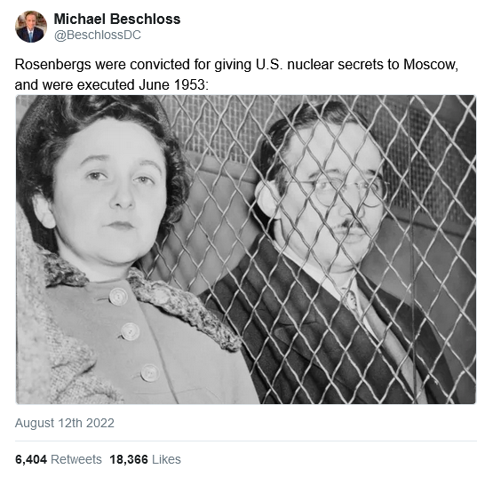 The man might as well wear giant neon signs on his head flashing “I am an unprincipled hack!,” “I have no professional integrity!” and “I am a trustworthy scholar like Sean Hannity is a trustworthy journalist!” See, the people who watch and believe the network Beschloss sold his soul to “contribute” to still think Trump is in league with Putin, and he has these “nuclear documents,” see, so he’s obviously planning on selling them to Russia, right? The historians association should kick Beschloss out, and might, if 90% of he members weren’t almost as biased as he is. Yes, this is the same guy who went on CNN election night and 2016 and lied (when a Presidential historian makes a ridiculously false statement about Presidential history to cover for his favorite losing candidate, he’s lying) about how Hillary’s loss was in part attributable to the “fact” that it is “very hard” for any party to win the White House three terms in a row. That tweet, however, is even lower on the ethics scale. How despicable for anyone, but for a respected historian, astounding.