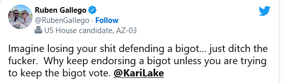 I have to mention, in fairness, that Gallego is also a terrible character to have in Congress. Here was his response to Lake’s attack: