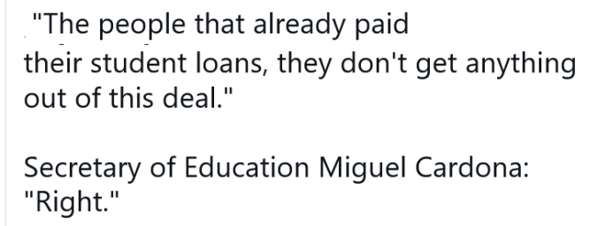 I commented that Conservative Christians get their theology very well. The debt of sin was not canceled at all. It was paid by someone else – Jesus Christ – who was innocent of creating it. By the same token, the debt of student loans are not being canceled either. They’ll be paid by people who didn’t cause the debt either, the taxpayers.