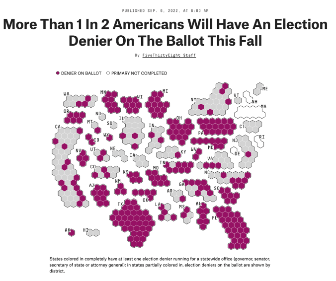 4. It’s a minor detail, but for some reason, it’s irritating me like a thistle in my pocket: what’s up with Silver’s headline saying “more than 1 in 2”? Is there a supply-chain problem with getting the word “half” distributed around the nation now? Does the expression “50%” rely on Chinese microchips or Ukrainian wheat? I’ve been on this planet for nearly 50 years (aka a HALF century, Nate), and I’ve never once heard or seen that number expressed as “1 in 2”. That’s as bizarre as someone measuring their height in Snickers bars or their age in light-miles.