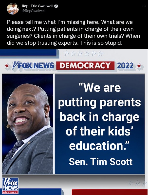 Now, you can nitpick the argument above and say that he said ‘surgery’ and not medical treatment and he said ‘trial’ and not your case, but Tim Scott didn’t say that he was putting each set of parents in charge of the entire school. Scott said he was putting the parent in charge of THEIR child’s education. In the same way I am in charge of my medical decisions and the decisions regarding my part of a trial. The way I read it, Swallwell objects to all three of those and instead insists that I am forced to do what teachers, medical professionals, and lawyers decide I have to do.