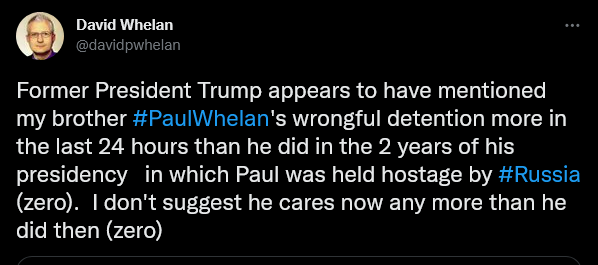 1. I will not criticize Biden for getting Griner out but not Whelan, because I have no knowledge of the negotiations or Russia’s position on the matter. While Trump may have been briefed on negotiations concerning Whelan (assuming he paid attention), he can have no knowledge of how the Russian position may have changed since the Russian invasion of Ukraine and Griner’s detention. I therefore find his criticism unfair for the same reason David Whelan’s tweet is unfair: both conflate inaction with indifference, based on ignorance of the negotiations.