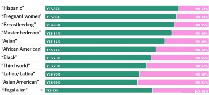 2. Speaking of “hate speech”…Inspired by a Pew survey that found a majority of Americans believe there isn’t any agreement on what language is considered sexist or racist because the boundaries keep shifting, the New York Times had the Morning Consult conduct a poll asking 4,423 subjects whether they would say various words and phrases. Here are the terms more Americans would say than not…