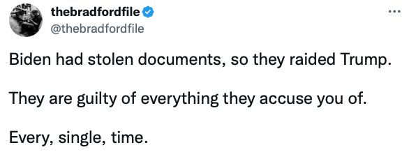 “Some see” is weasel speak. Who cares what they see? Is it actually happening? And the answer here is “maybe”, the media writ large is in the tank for Biden, there’s definitely some suspect differences between how the records were tracked, but there are also differences in how Biden and Trump acted, and again… While we can complain about the double standards, and while we can push to correct them, I don’t think we’re saying that what Trump did was right because Biden did it, we’re saying what Biden did was wrong and the FBI should treat it more seriously. Aren’t we? Or do you not actually think what Biden did was wrong, and you’re just highlighting the hypocrisy?