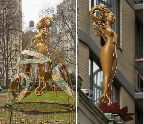5. What THE HELL is going on with public art? Feminists are cheering the statue of a woman recently erected on the top of a Manhattan courthouse, “a female figure on a level plane with the traditional, patriarchal depictions of justice and power.” It’s a version of a similar work by the same artist in Madison Square Park, “Witness,” a “monumental female figure measuring 18 feet tall and wearing a hoop skirt inspired by the courtroom’s stained-glass ceiling dome.” Ready or not, here are those statues: