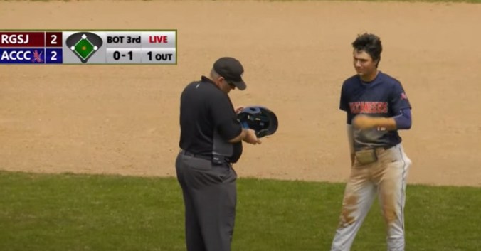 Rowan College Gloucester County was playing Atlantic Cape Community College (New Jersey) in a baseball game when the Rowan first baseman noticed little voices coming out of an Atlantic Cape baserunner’s helmet. He notified the umpire, who checked the helmet: sure enough, there was an electronic listening device inside. After a search, a device was found on a second player too. The assumption is that someone was stealing catcher’s signs from the stands, and using an electronic device to alert Atlantic Cape batters what pitches were coming.