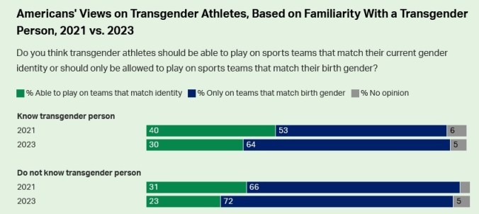 I spent every Saturday for months at the Harvard Medical Library reading about intersex, pseudo-hermaphroditism, and horrible tropical diseases (“Why is that Indian man sitting on that sand bag…OH MY GOD!!!!) as well as other cock-and-ball-related matters, and I must say, it demystified the topic for me (I got an A+ on the paper, but the oral presentation was tricky). How many of the people surveyed by Gallup have been following the issue over the past couple of years? Do they know about Lia Thomas? I like to know what female athletes think, as a group. How about the parents of female athletes? This is an ethics issue, and Gallup is headlining about “morality.”