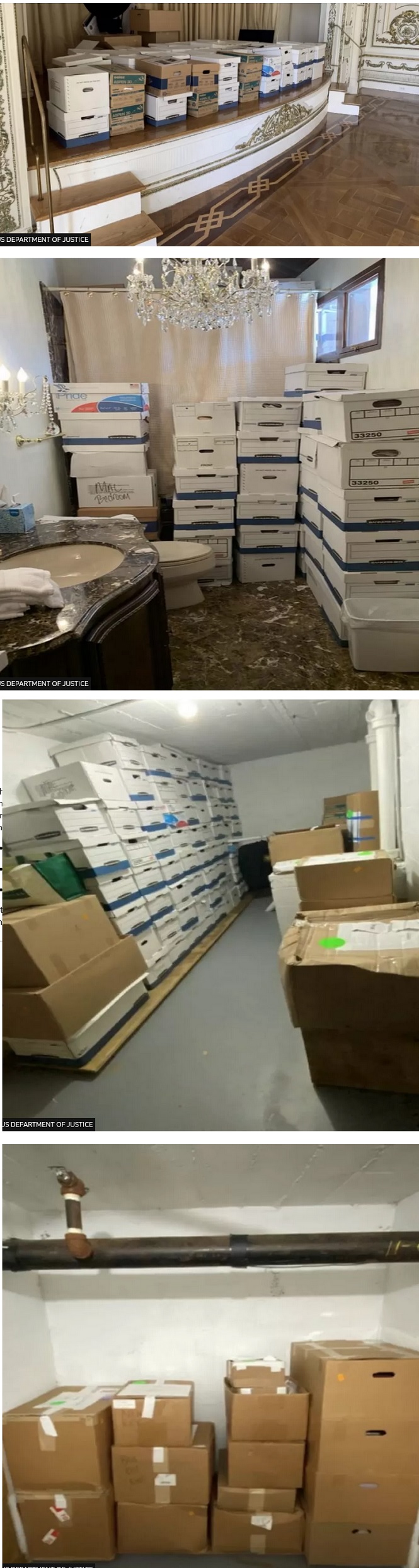 The indictment says that Trump’s alleged illegal conduct related to 102 classified documents. What you see above are four of six photos the Justice Department included in the indictment, apparently showing Trumps trove of stolen government materials. I don’t know how large the documents were, but assuming that those photos weren’t staged, they must have been taken before the boxes were examined. I’ll believe they contained paper (unlike the very similar piles of boxes in three of the rooms in my home, which also contain, for example, dinosaur models), but it is wildly unlikely that the boxes contain just 102 classified documents.