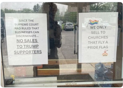 These signs were allegedly posted yesterday in response to the Supreme Court’s hay trick yesterday. If genuine—and who knows?—‘s staff the owner of the establishment is a medical miracle, apparently living without a brain. As simultaneous virtue-signaling and IQ 80 signaling, this is special. Let’s see: the Supreme Court did not rule that businesses can discriminate. How will the store’s staff identify “Trump supporters”? How often does a church walk in a store to buy anything? Do churches even fly flags? I’ve never seen one.