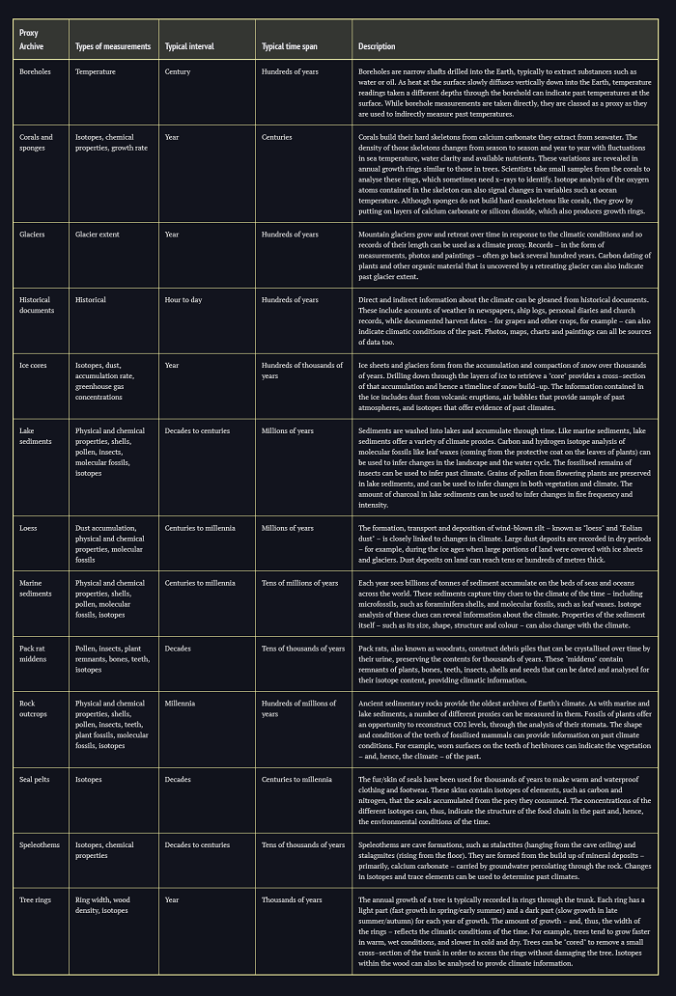 Recently, Major League Baseball teams broke the record for the most runs scored in all games on a single day. It was remarkable, because the record was more than a century old: the day occurred in the 19th century. All of the articles about this event specified the day. If, as Omar’s ignorant tweet claimed, the Earth had broken its previous record for “hottest day in 120,000 years,” there would be a day from 120,000 years ago that held the broken record. No source mentioned such a day, however, because there are no daily records of the Earth’s weather—daily temperature is weather, not climate—from 120,000 years ago or even a thousand years ago (though we know Pompeii got pretty damn hot when Mt. Vesuvius erupted in 79 AD.) Estimates of global climate in the periods before records were kept depend on “proxy data.” Here is a chart explaining what proxy data can tell scientist about distant climates: