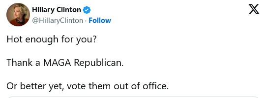 There is literally nothing “MAGA Republicans” have done that has had any effect on the weather this summer, and there is nothing they could do. Hillary knows that, and she declared it anyway, because she thinks the American public is stupid, and has the same regard for the truth as her husband.