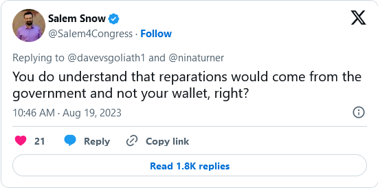 5. I think you might have missed the point. None of his voters pay taxes. Therefore, he is correct that the money would not come from their wallet. The money in their wallet, like reparations, come from taxpayers. Once over half the voters don’t pay taxes (like now), they get to vote themselves money from taxpayers.