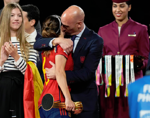 Shortly after the championship game’s final whistle, Luis Rubiales, the head of Spain’s Soccer Federation, joined the jubilant on-field celebration, and at the award ceremony, Rubiales took midfielder Jennifer Hermoso’s head in both his hands and…kissed her on the lips!!!!