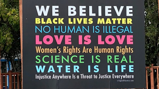 I admit that this was the first thing I though of when he announced his “commandments,” especially since “God is real” seemed to deliberately counter “Science is real.” To the extent that Ramaswamy is mocking those signs, good: they deserve to be mocked. At least “God is real” is a clear statement; “Science is real” is moronic: who doesn’t think science is real? The rest of the Mother Jones piece is self-indicting, and a snap-shot of the muddled thinking of the extreme left. The indignant authors writes, “Commandment number 4 is the inverse of “Black Lives Matter”[So BLM is a racist organization then. I thought so…] number 5 is the response to “No human is illegal” [Wait: I thought the claim that progressives want open borders was a conspiracy theory!] ; the supremacy of the nuclear family counters “Love is love” [“Love is love” is too fatuous and vague to counter]; “There are two genders” responds to “women’s rights are human rights” [ Huh?] ; “Human flourishing requires fossil fuels” answers “Water is life” [How?]; and the Constitution’s protection of freedoms negates the assertion that “Injustice anywhere is a threat to justice everywhere” [I’m afraid to ask what that’s supposed to mean.]