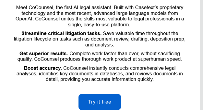Just as I was preparing yesterday for today’s 3-hour legal ethics CLE seminar (which, coincidentally, contained a section about the unsettled status of lawyers using artificial intelligence for legal research, writing and other tasks in the practice of law), I received this unsolicited promotion in my email: