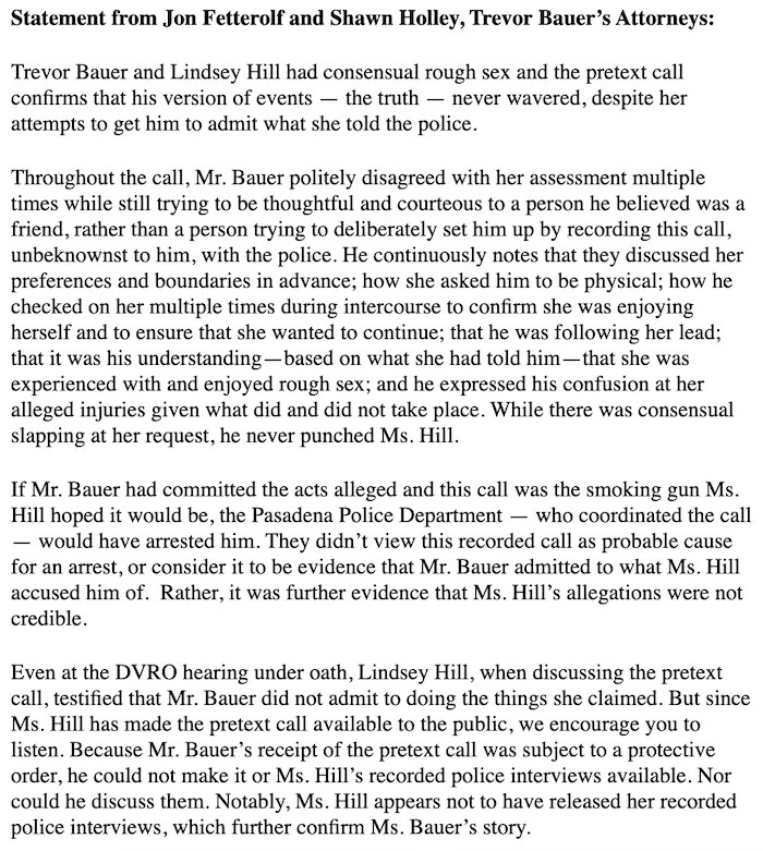 Major League Baseball was put in this position by Lindsay Hill; it is one of her victims. If you want to hold Bauer responsible for not being more careful choosing his sex partners considering his obligations to the game, I won’t disagree.