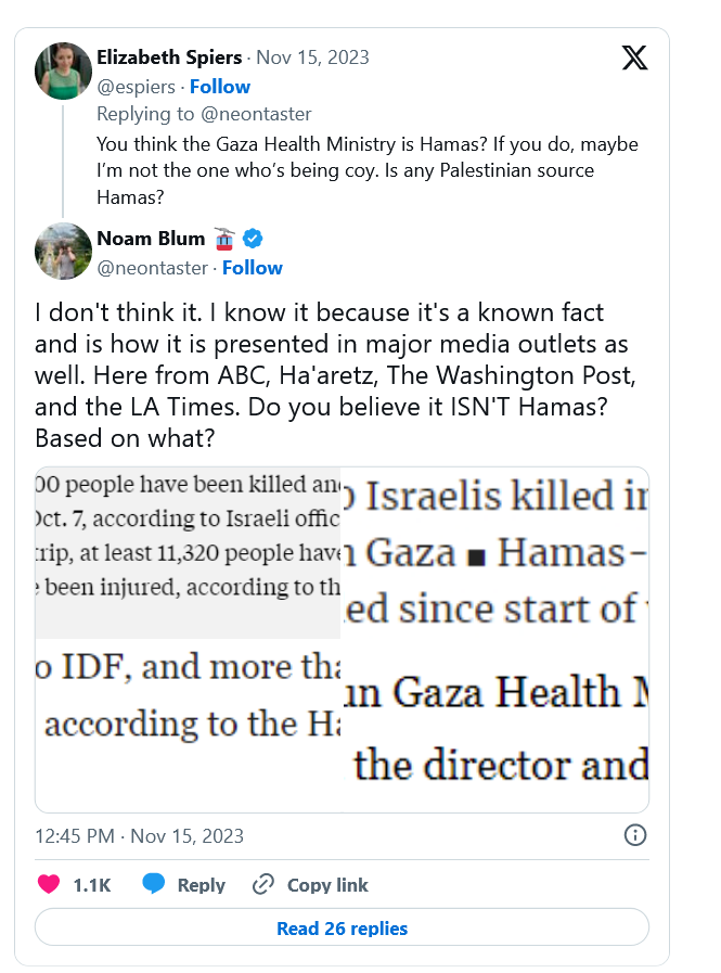 What set him off was a legitimate provocation. Elizabeth Spiers, who is a frequent contributor to the New York Times op-ed pages, revealed in a social media spat with Noah Blum the Chief Technology Officer of Tablet, which focuses on Jewish issues, that she thinks Hamas doesn’t run Gaza: