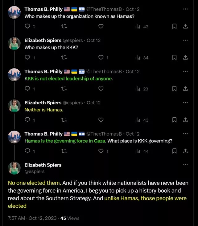 3. My earlier post about emotion explains this. Elizabeth Spiers is arguing from emotion. She ‘feels’ that the Palestinian cause is just, so any argument that suggests it isn’t is just wrong. Logic doesn’t matter, facts don’t matter. Those are tools of toxic masculinity and whiteness. She ‘feels’ the Palestinians are right, and the result is an argument like this.