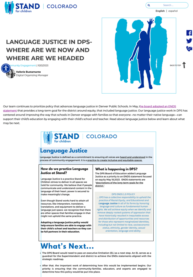 Our language justice work in DPS has centered around improving the way that schools in Denver engage with families so that everyone –no matter their native language—can support their child’s education by engaging with their child’s school and teacher