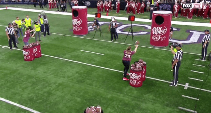 Dr. Pepper held its annual, silly, Dr. Pepper Tuition Giveaway at halftime during the game between the Texas Longhorns and the Oklahoma State Cowboys over the weekend. Two college students had to toss as many footballs as they could into their respective Dr. Pepper-branded bins five yards away within the allotted time, with the winner getting $100,000. It was a close contest, with the two tied at 10 successful tosses each at the end, forcing an overtime 15-second period. And they tied again, at 16, forcing a second overtime period.