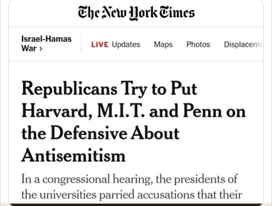 Oh, they “tried” to put the three presidents on the defensive, did they? They and many more colleges have been “on the defensive” since the Hamas attack put in sharp contrast the results of far left indoctrination in American higher education. In the skit, however, it is the Republican Congresswoman displaying hypocrisy, not the three officials, especially Harvard’s Gay, whose university was suddenly extolling free speech after repeatedly curbing it when the speakers offended the campus woke. “I am here today because hate speech has no place on college campuses,” the skit’s Stephanik shouted. “Hate speech belongs in Congress, on Elon Musk’s Twitter, at private dinners with my donors and in public speeches by my work husband, Donald Trump.”