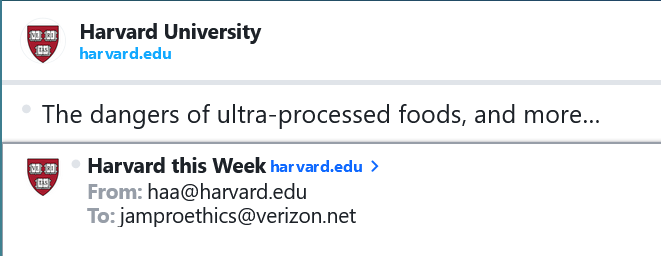 I Can’t Resist Posting This Before I Hit The Sack…. December 11, 2023December 11, 2023 / Jack Marshall This was sent to me by Harvard late Sunday night. Somehow, I doubt that the dangers of ultra-processed foods are really the top priorities in Cambridge right now…. Share this: Click to share on X (Opens in new window) X Click to share on LinkedIn (Opens in new window) LinkedIn Click to share on Facebook (Opens in new window) Facebook Click to share on Reddit (Opens in new window) Reddit Click to print (Opens in new window) Print Click to email a link to a friend (Opens in new window) Email Like Loading... Related