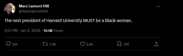 Back to the ethics zugzwang: Who can Harvard recruit to succeed Gay that won’t cause more controversy and criticism? Essentially nobody. Harvard faces a challenge to its woke priorities (ideological indoctrination, not superior education, is its mission now, as Ethics Alarms has been pointing for years) flowing from the Supreme Court finding that Old Ivy was discriminating against whites and Asians, so it is almost forced to find another diversity hire like Gay to fight the good fight. Marc Lamont Hill, himself a diversity hire but with the wrong chromosomes, made this clear with a tweet any legitimate scholar would be embarrassed to post (5.5 thousand followers loved it, the morons):