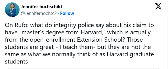3. It is even worse. In the original tweet, Rufo states that he received his Master’s through the night school and it isn’t considered as prestigious as the normal graduate school. Her clarification about what he SHOULD have done are exactly what he did.