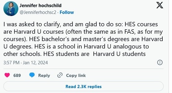 Your assessment of Dr. Hochschild is spot on. She believes students of HES are less than those she considers REAL Harvard students. She considers HES degrees to be of lesser importance and value than “REAL” Harvard degrees. Her backtracking is just lies.