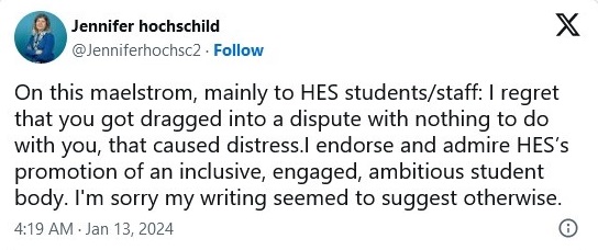 Then the Harvard Extension Student Association responded to Hochschild’s slur and her slur trying to soften the slur, writing that they “are deeply concerned and disappointed by the recent comments made by a Harvard Extension School professor on the social media platform, X.” ” Although the professor attempted to backtrack on her statements, the initial message conveyed a different sentiment, one that undermines the value and reputation of our institution,” the HESA wrote. “Generalizations that denigrate HES students do more than unjustly diminish individual achievements; they erode the foundational values of diversity, respect, and academic rigor that are essential to the fabric of Harvard University, and all of its degree-granting schools.”