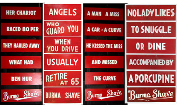 I never saw a Burma Shave roadside sign sequence—believe it or not, I’m too young—but I remember the fond remembrances of my father regarding the famous advertising campaign, and read several articles about the rhymed gags in Readers Digest, American Heritage, and elsewhere. Surely you must have heard about them…