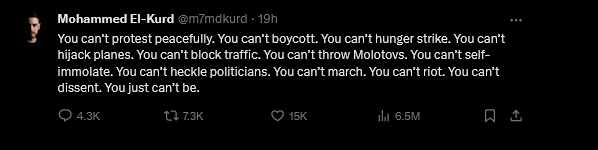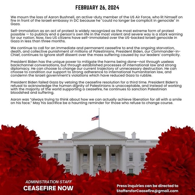 Brilliant. This New York-based writer and apologist for terrorism lumps protesting peacefully, dissent, marching and heckling politicians in the same category as suicide, rioting and law-breaking. Yet even he has a better grasp on reality than “the Staffers for Ceasefire.” In a related tweet, he suggests to these fools, “The best eulogy you can offer Bushnell is resigning en masse.”