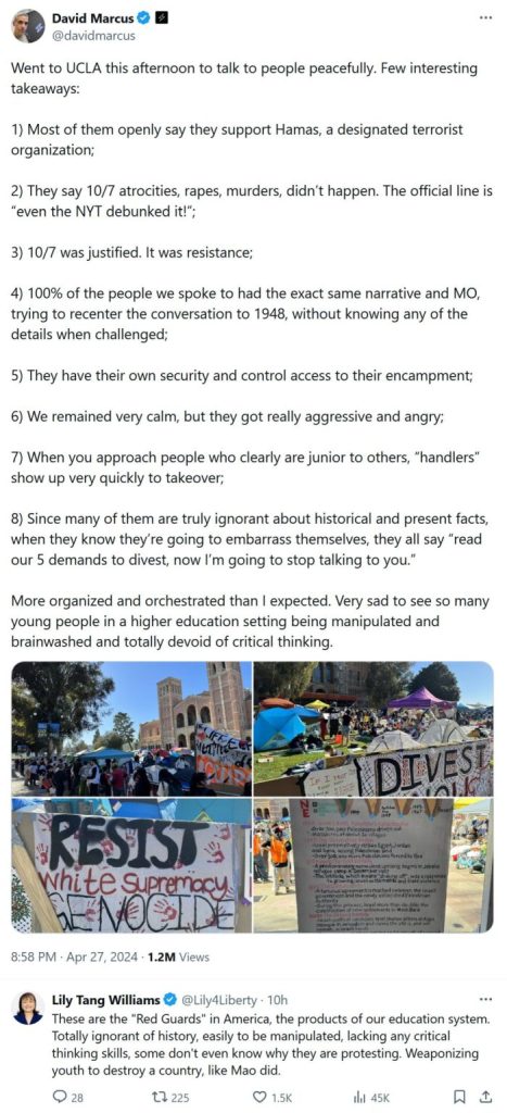 1. Déjà vu! The moment I lost all sympathy or respect for the students at my college demanding various things while taking over buildings and disrupting my education was when they added amnesty to their “demands.” The terrorist assholes at Columbia are doing the same thing now. Nobody should give serious consideration to the positions of such cowards. Writes David French, “When universities can actually recognize and enforce the distinctions among free speech, civil disobedience and lawlessness, they can protect both the right of students to protest and the rights of students to study and learn in peace.” And when I can fly to the moon by flapping my arms, I’ll save a fortune on gasoline. The vast majority of today’s college administrators—Haven’t female college presidents just covered themselves in glory lately? Another DEI triumph!—are the direct ideological descendants of those arrogant, unaccountable revolutionaries of yore.