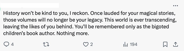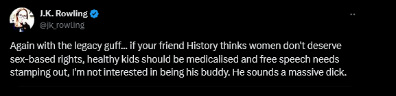 Asshole. Meanwhile Rowling is not backing down, and has the rhetorical skills to make her point with brio. In a subsequent exchange on Twitter/”X”, this fatuous post directed at Rowling…