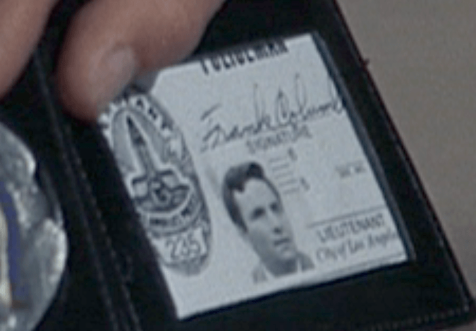 For example, above you see a blow-up of the badge Columbo presented in the very first episode of the series, “Dead Weight.” A police detective needs an ID, and an enterprising props professional would take pride in making one that was accurate to the last detail, which meant that it had to list the owner’s first name. As you can see, the name used was “Frank.”