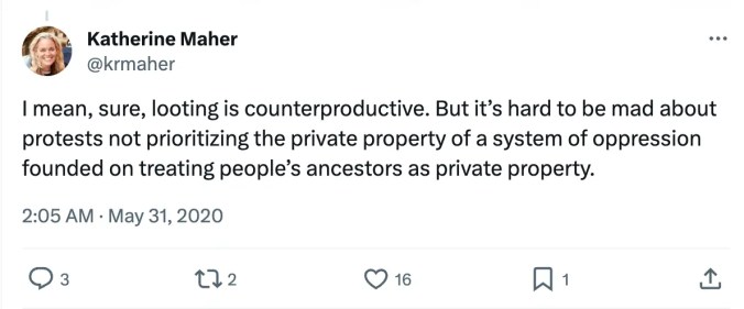 Of course not. Using ALL of them, together with calling looting “counter-productive,” however, compels the diagnosis. I know you would never use “folx.”