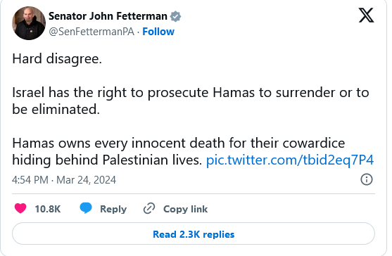 I’m not a constituent of Sen. Fetterman, but he has been a revelation, particularly with the Israel/Hamas issues. I don’t what all else he supports, but kudos to him for taking this stance.