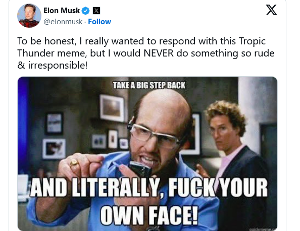 The “Bite Me!” Award that Ethics Alarms hereby bestows on Elon Musk is the honorable and admirable version of the schizophrenic designation as opposed to the alternative handed to Ann Althouse in this recent post. To alleviate confusion, I will henceforth describe what Musk has earned with his tweet above as The Golden “Bite Me!,” which will be awarded here when an individual displays an inspiring level of defiance“in response to being bullied, pressured and threatened into submissiveness” by sending the unambiguous and fearless message, “Do your worst. I believe in what I am doing, and I don’t grovel to mobs.”