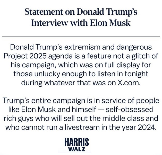 Musk invited Harris to have a similar conversation with him on Twitter, and she refused. Her campaign is ethically estopped from making this ridiculous and hypocritical claim, yet there it is.
