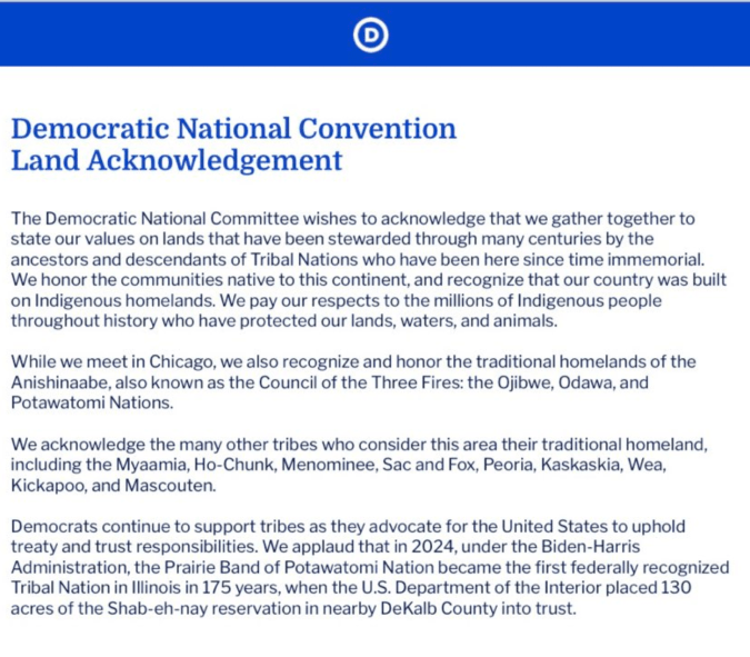 2. I had a similar thought: the sheer number of groups with an acknowledged history on the land indicates some combination of a) the DNC is going for maximum virtue-signaling by referring to a much larger area of land than they’re actually using for the convention, b) the land being acknowledged was formerly a cosmopolitan area with multi-ethnic neighborhoods, and c) those groups’ claims on the land were sequential, not contemporaneous–some of those groups killed people from other groups and took over the land. Tale as old as time, song as old as rhyme: kill them, take their stuff.