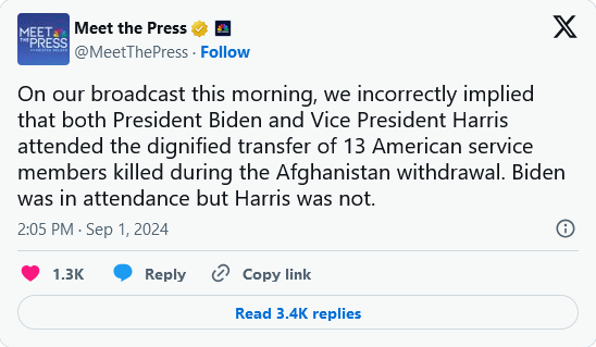 No, Welker didn’t “imply” that. She stated it as fact. As fact. NBC could have said “We were mistaken. Welker incorrectly said that Harris attended the “dignified transfer,” and that was untrue. ‘Meet the Press’ apologizes for misinforming our viewers. Again.”