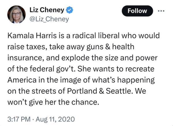 That’s not to say that Cheney’s characterization of Harris was necessarily fair and accurate, only that if she thought it was fair then, it would be just as fair now. Changing one’s mind based on new information is always a valid defense against the accusation of hypocrisy, but all that has changed for Cheney is that her only career path now is as an anti-Trump ex-Republican who can make the Angry Left’s spirits soar like a hawk. She can get speaking gigs at “I Hate Trump” rallies.