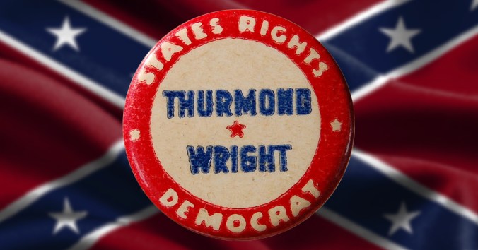 The Dixiecrats (formally the States Rights Party) was a break-away group from the Democrats, devoted to denying the rights of black Americans like the pro-abortion Democrats today deny the right to life of the unborn. The movement was officially dead after the 1948 election, but its mission was no more unethical and self-evidently wrong than that of the pro-abortion absolutists today, and while the Southern racists wanted to maintain the enforcement mechanisms of Jim Crow, like lynching, they did not want to kill all of those their party was targeting.
