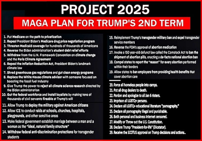The Project 25 hysteria was one of the Democrats’ more despicable gambits. I keep seeing that list above or similar ones posted as Trump’s agenda. The list is hilarious, and anyone who believes that’s what’s in the document thinks the Constitution was written by Donald Duck and begins, “There once was a man from Pawtucket….” The website of the exercise , essentially a brain-storming session among many conservative groups, is easy enough to check, but know, the Trump Deranged hysterics would rather use a phony meme designed to demonize the Right than discuss the real thing. They deserve to live in Spain.