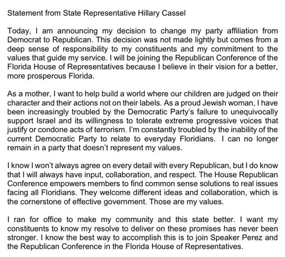 Broward County Rep. Hillary Cassel announced yesterday that she will leave the Democratic Party and join the GOP, becoming the second state lawmaker to do so this month. Hillsborough County Rep. Susan Valdés also announced this month that she had joined the Republicans.