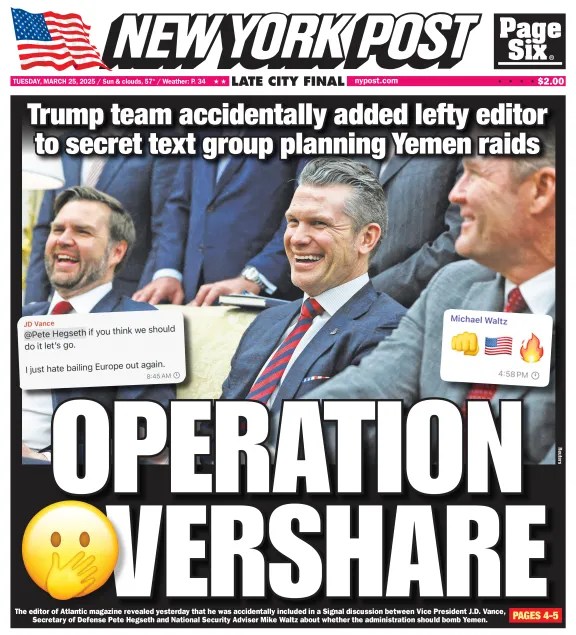 With Trump officials, the President, his paid liar Karoline Leavitt stating, and both John Ratcliffe and Tulsi Gabbard swearing under oath that top US officials discussing operational details of plans to bomb Yemen before the operation miraculously did not contain any, classified information, The Atlantic today released much of the transcript as collected by editor Jeffrey Goldberg in a new article. I haven’t read the whole thing because I will not give a cent to The Atlantic, now one of the most notorious Axis allies. But the excerpts I have read elsewhere are hardly the discussions of favorite recipes for guacamole.