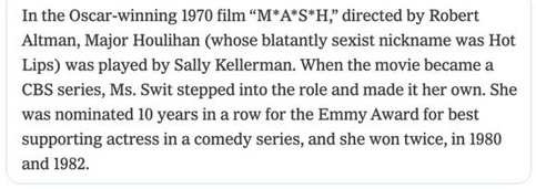 1. Loretta Swit died. She was a minor star who made her name and fame playing the character in “M*A*S*H” that Sally Kellerman had created in the hit Robert Altman movie in the long-running TV adaptation. (The TV show got Swit a lifetime sinecure guest starring on shows like “The Love Boat” and “Murder She Wrote” for the remainder of her career.). The character’s name was “Hot-Lips Houlihan, and because the New York Times cannot stop injecting leftist sentiments and propaganda into every corner of the paper, it wrote in Swit’s obituary,